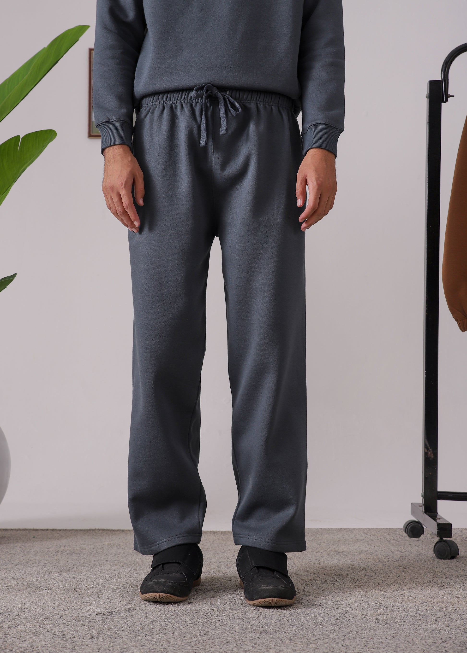 Trouser: Relaxed-fit, open-bottom cotton fleece trousers with zipper pockets and an elastic waistband crafted for warmth, comfort, and effortless movement.